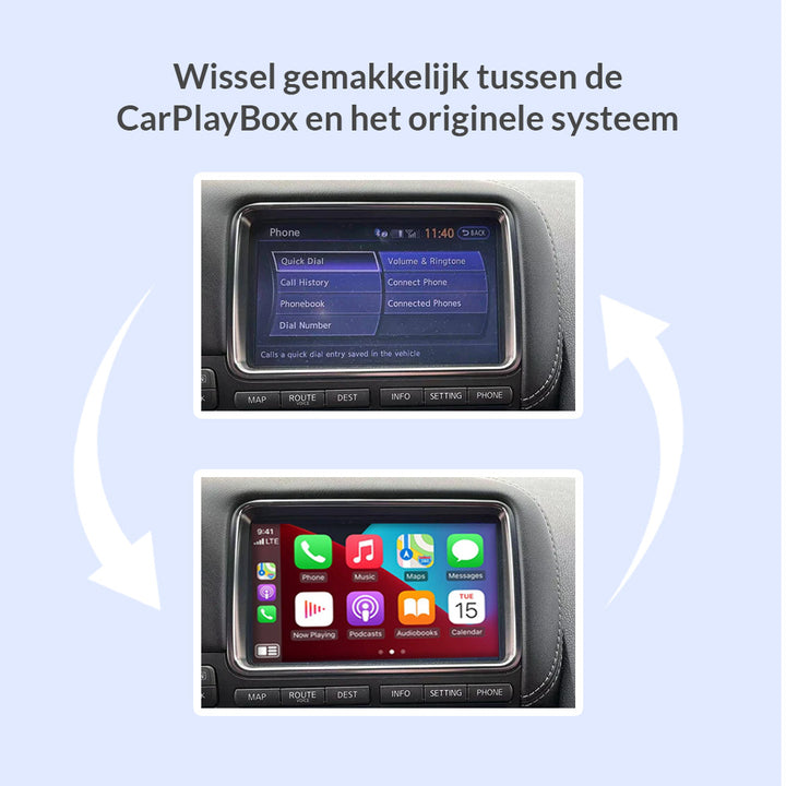CarPlayBox is eenvoudig te installeren, de CarPlayBox wordt discreet achter het infotainmentsysteem geplaatst en start automatisch op bij het instappen, zonder handmatige handelingen.