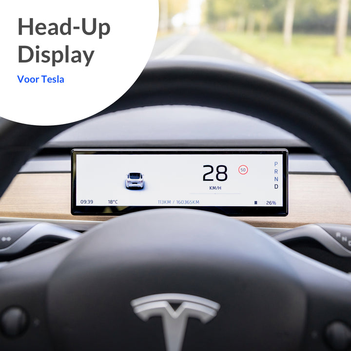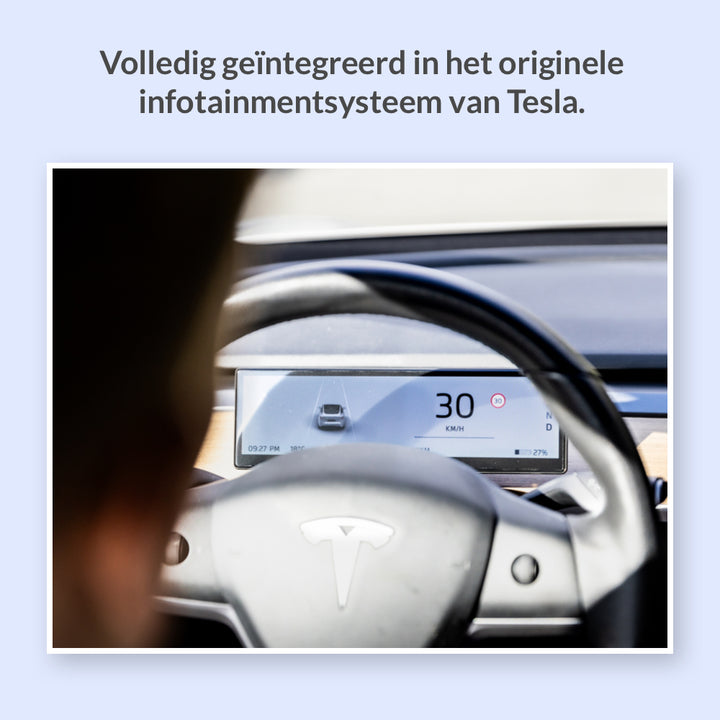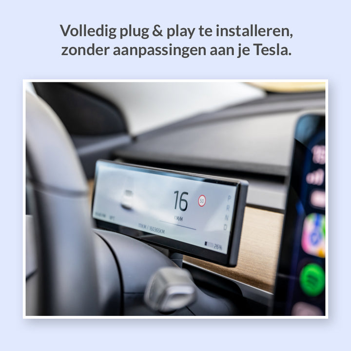 Het display integreert naadloos met het originele Tesla-systeem en projecteert realtime gegevens zoals snelheid, richting, versnellingsstand, temperatuur, batterijpercentage en meer.